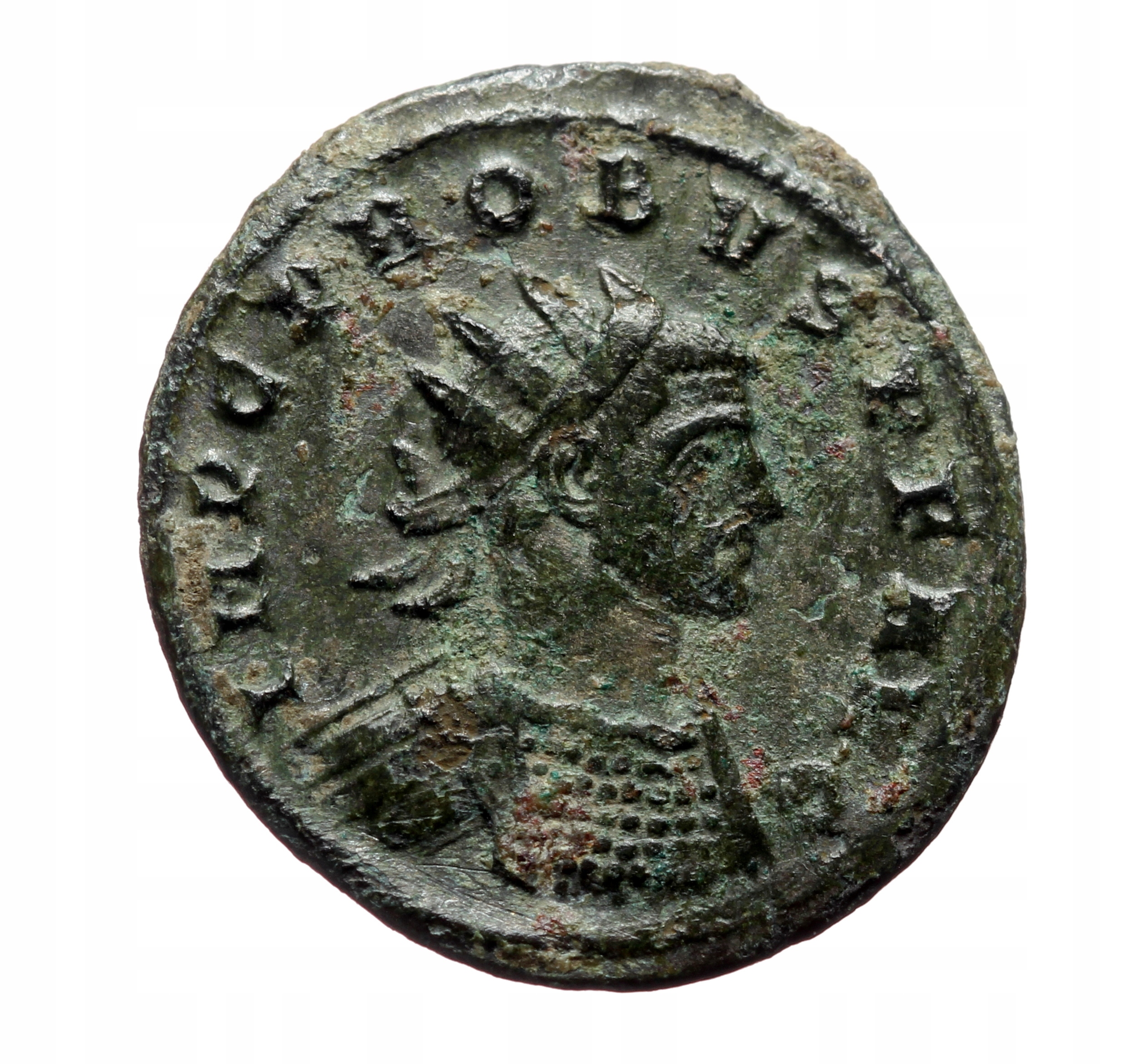 aw: IMP C M AVR PROBVS P F AVG. Бюст імператора в радіальній короні та панцирі праворуч