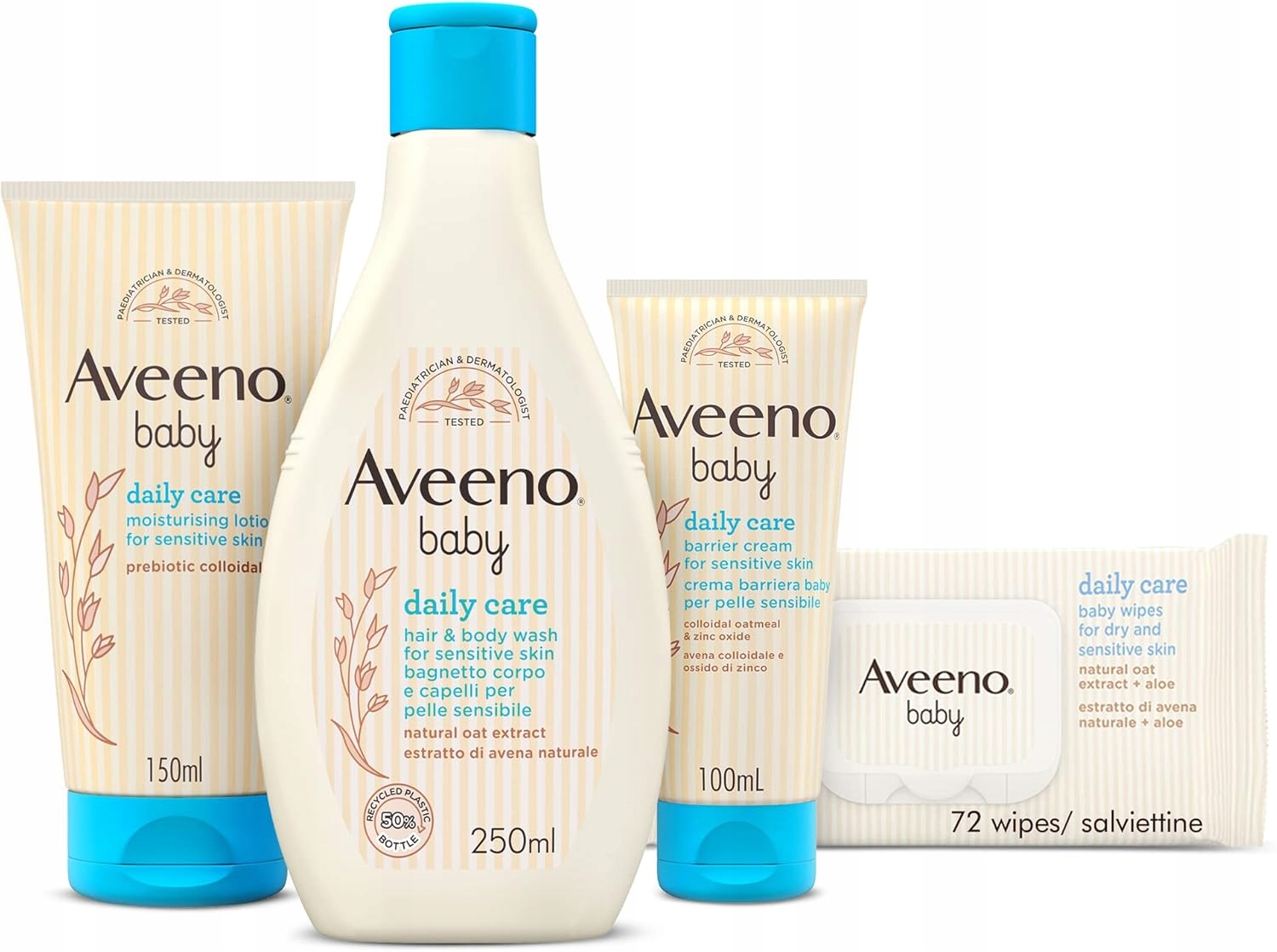Набір новонароджених Aveeno, містить 100 мл бар'єрний крем, зволожуючий крем для обличчя та тіла 150 мл, гель для душу для 250 мл ванни та тканини для новонароджених 72 штук