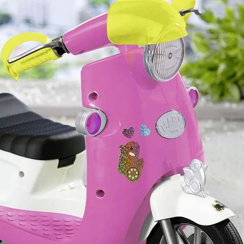 Рожевий скутер, оснащений покажчиками повороту, клаксон і стелаж для покупок, b> готовий до будь-якої міської експедиції. Бебі Борн зручно сидіти на широкому сидінні, тримаючись за кермо, а завдяки ремінцям на руках вона завжди почувається в безпеці за кермом.