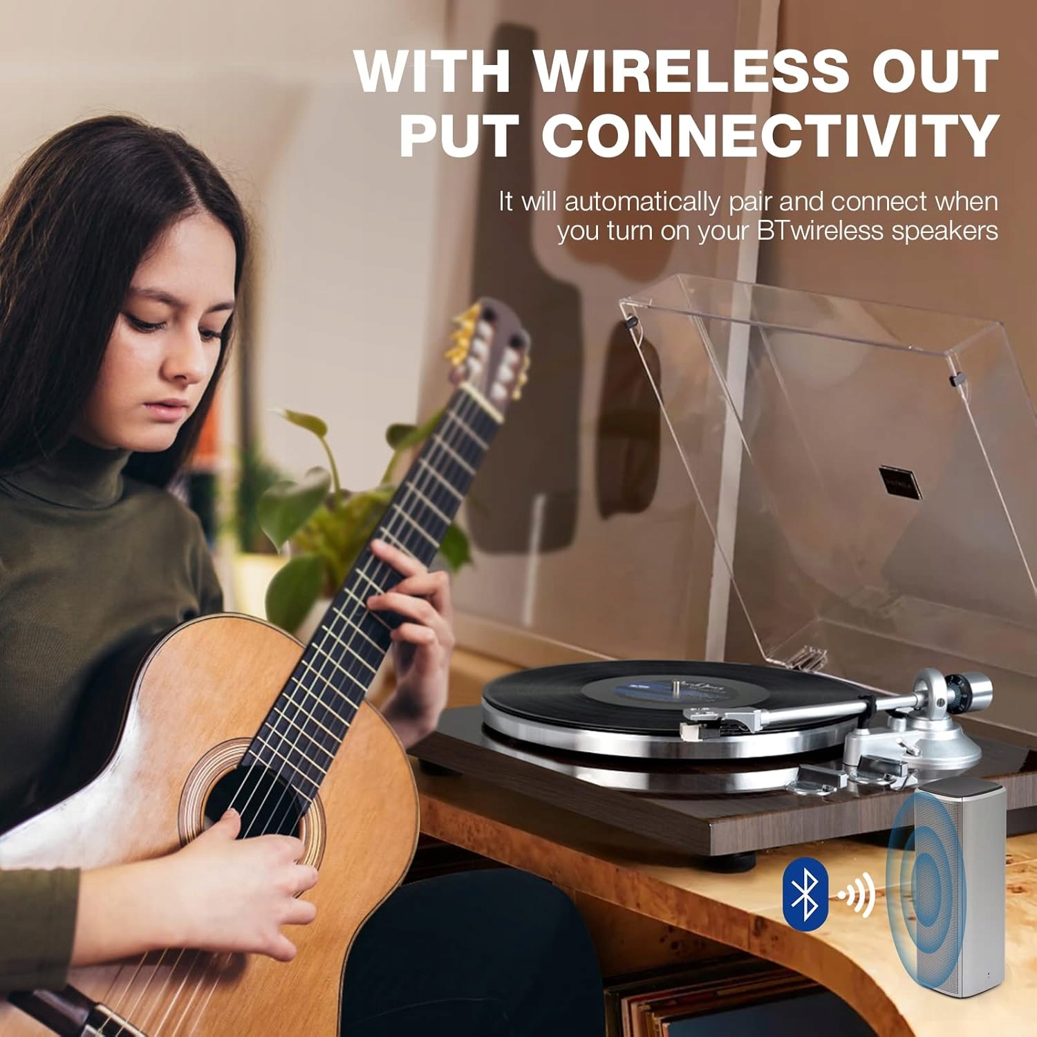 бездротова вінілова пластина - це елегантний вінтажний поворот із сучасними функціями, що ідеально підходить для закохань класичного звучання. Оснащений 2-ступінчастим приводом ременя (33 та 45 об / хв), діамантовою магнітною вставкою та суцільною алюмінієвою вібраційною платформою, забезпечує виняткову точність та глибину звуку.