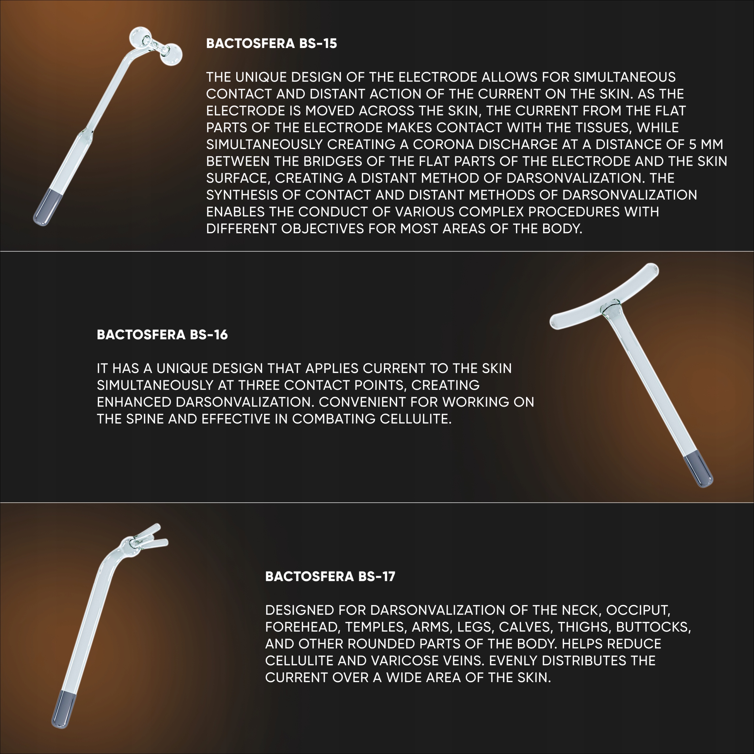darsonval bactosphere bs-14 "t"-умова має широку ділянку покриття шкіри і призначений для плоских ділянок тіла (спина, поперек, грудка, шлунок, кінцівки). І віддалений ". Унікальна структура електрода дозволяє одночасно контактувати та віддалений ефект на шкіру. Проходячи електрод по шкірі, електроенергія з сферичних частин електрода потрапляє в тканину в контактний спосіб, тоді як коронний розряд відбувається на відстані 5 мм між зведеними сферичними частинами електрода та поверхнею шкіри, створюючи дистанційну техніку. Дарсонізація дозволяє проводити багато складних процедур для більшості частин тіла. Дарсоналізація Bactosphere BS-17 "дуга" призначена для дарсонізації шиї, задньої частини голови, лоба, храму, рук, ног, гомілки, стегон, сідниць та інших закруглених частин тіла поглинає целюліт і варикозні вени.