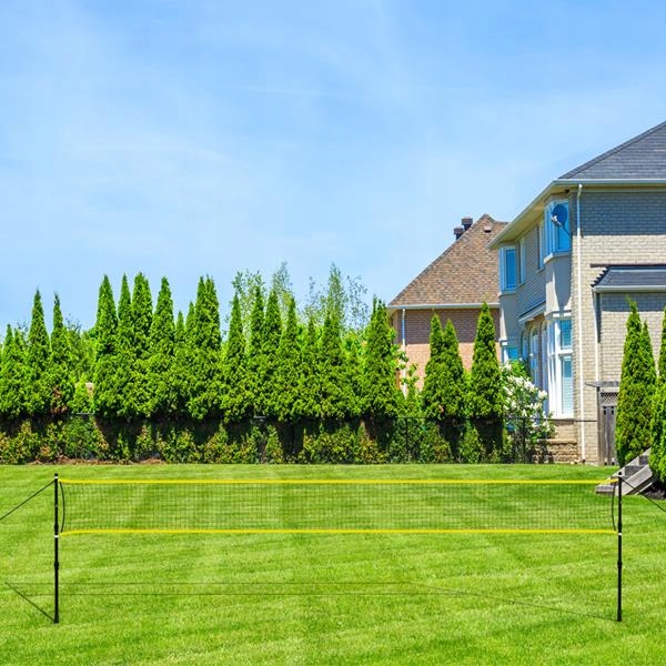 Продукт встановлюється шляхом дотримання до заземлених стовпів, які є рамкою, і до яких ми прикріплюємо сітку. Пости є телескопічними і пропонують можливість повісити сітку на двох висотах. І сітка, і кадр стійкі до погодних умов. Довжина сітки перевищує 6 м, тому вона дозволяє вільно грати, два матчі одночасно.