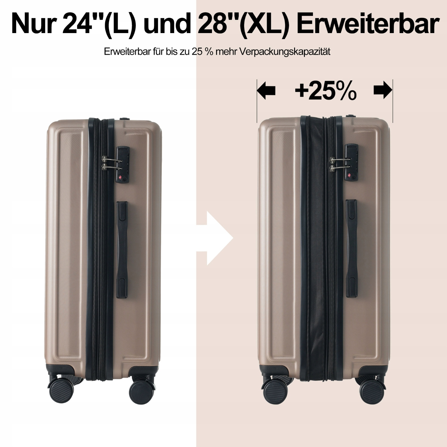 Універсальний дизайн: Наші валізи характеризуються інноваційною конструкцією, яка легко збільшує багажний простір на 3 - 5 см. Це означає, що ви можете гнучко додати додатковий простір, адаптуючи його до індивідуальних потреб мандрівників.