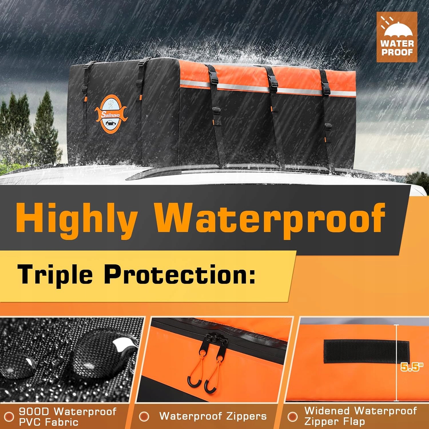 Водостійка ПВХ-тканина 1200D Використовуйте тришарову ПВХ-тканину високої щільності 1200D. Ми оновили пакет даху, щоб захистити ваші речі від сонця, вітру та дощу. Подвійні шви роблять багажник на даху надзвичайно водонепроникним і його можна використовувати в різних погодних умовах, таких як дощ, сильний дощ, сніг тощо.
