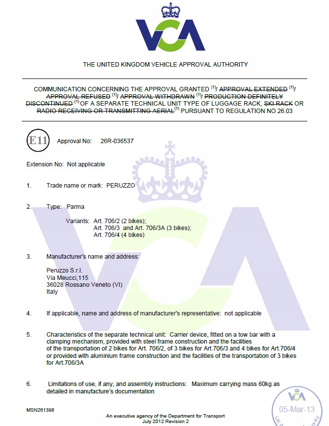Багажник Peruzzo Parma 4 має сертифікат VCA, що підтверджує його високу якість і безпеку.