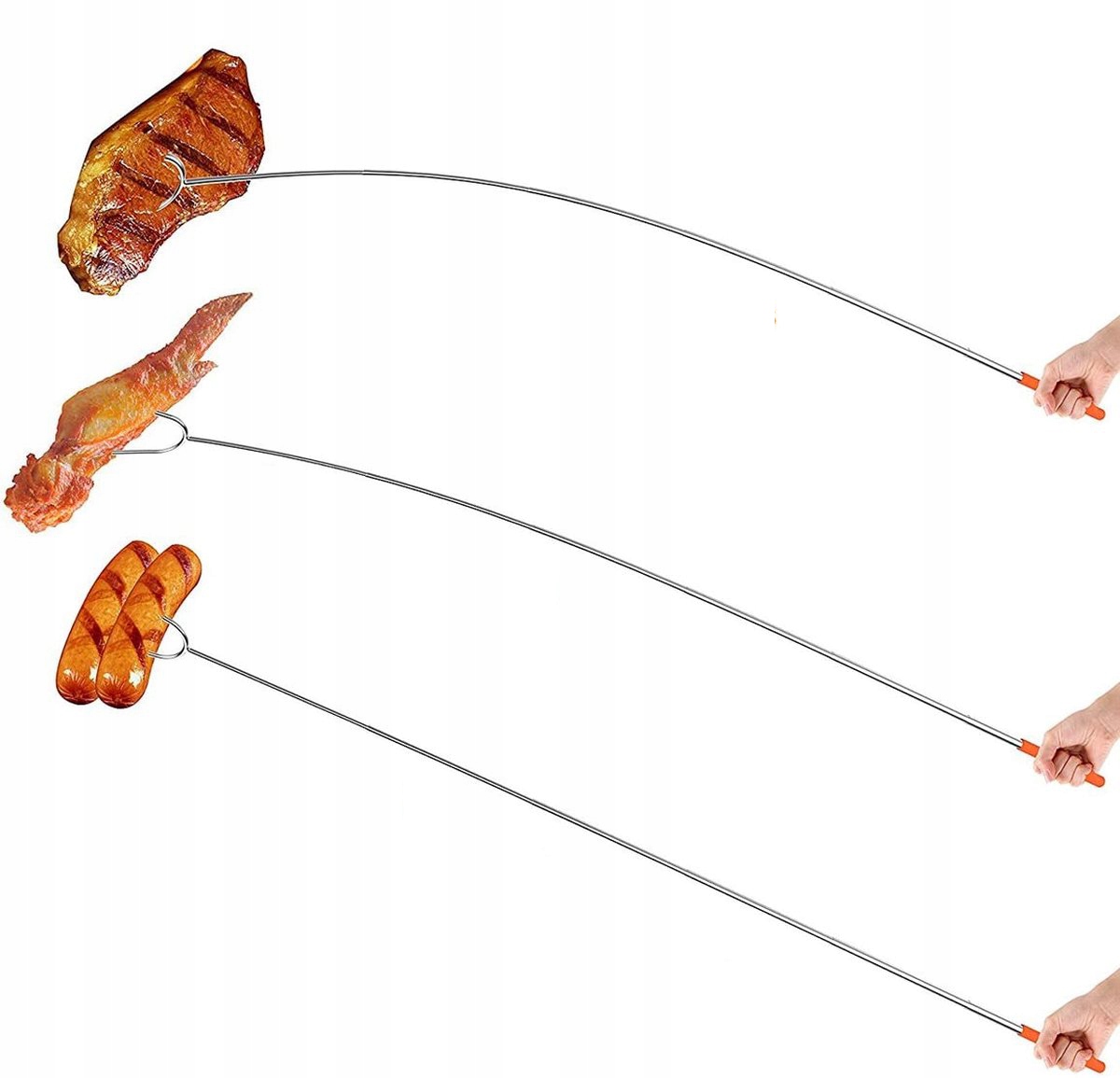 Виготовлені з високої якості нержавіючої сталі 304 , ці обсмажні палички стійкі до іржі та безпечні для грилю. Телескопічний стрижень сильний і стабільний, безпечно тримаючи їжу на місці.