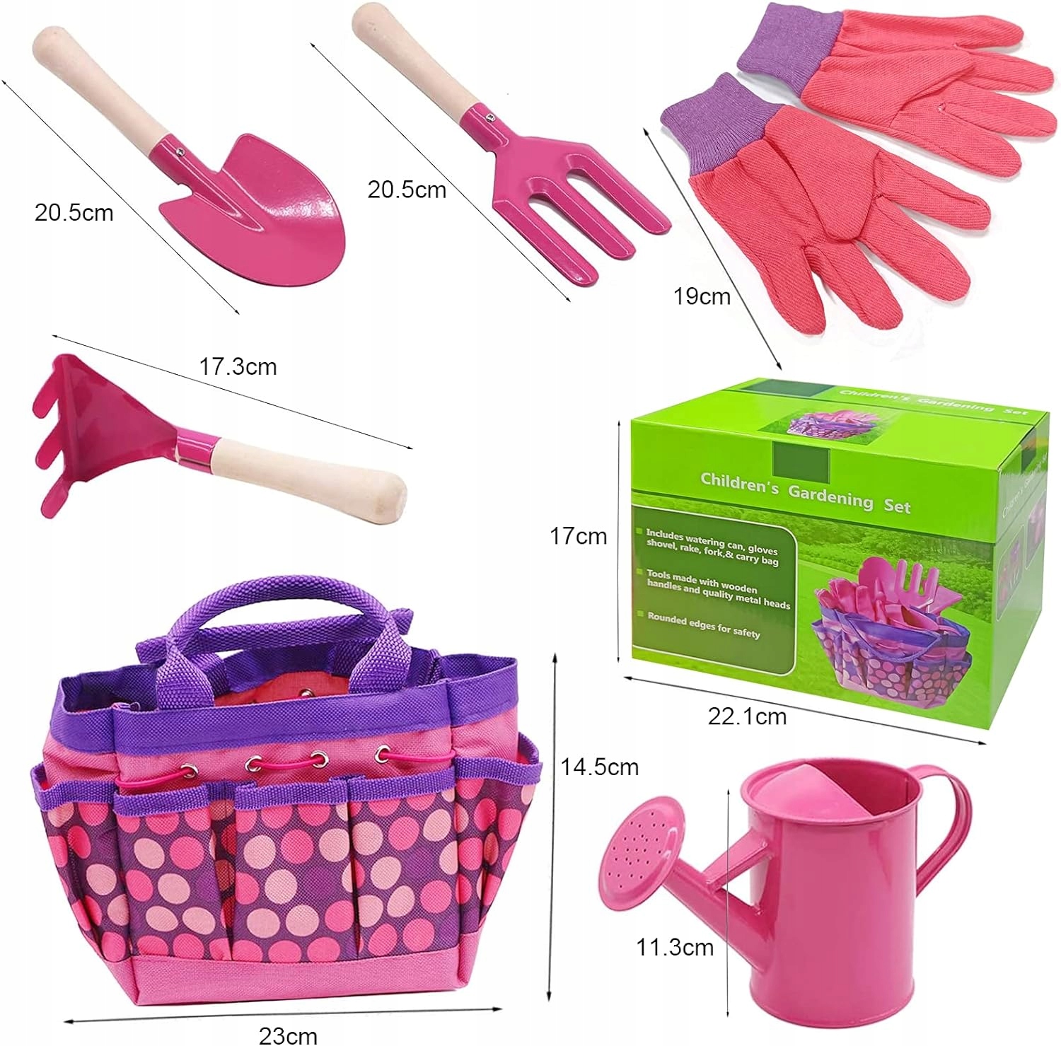 - 【Універсальний інструмент для дитячого садка】 Цей набір інструментів для дитячого садка включає лійку 11,3 см, рукавички 19 см, лопату 20,5 см, граблі 17,3 см, лопату 20,5 см і переноску сумка 14,5 см. Діти можуть почати вирощувати справжні рослини, вивчати науку та природу, розвивати навички та проводити багато щасливих годин у саду, використовуючи це справжнє садове обладнання.