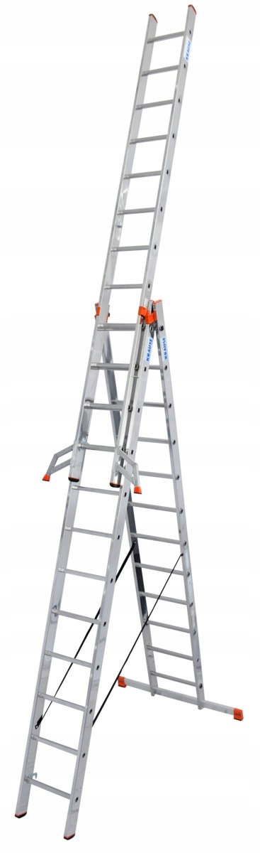 Триелементна алюмінієва багатофункціональна драбина для використання в якості прикріпленої драбини (висота Роб. 9.30м), ковзання та вільно-речовина зі висувним елементом (висота 6,55м). Завантаження драбини під час транспорту, стійкого до розриву та погодних умов, ремені запобігають драбинам, що запобігають/розповсюджувати сходи- широкий стабілізатор, що забезпечує стабільність сходів- проти ковзання (Safeticap)