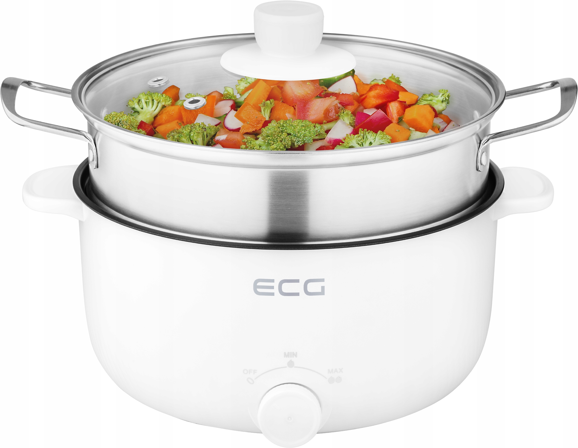 Електрична каструля об’ємом 3 л особливо підходить для приготування супів і соусів, внутрішній контейнер з нержавіючої сталі з антипригарною поверхнею, пароварка з нержавіючої сталі, скляна кришка, знімний кабель, дві потужності приготування 450 Вт і 900 Вт