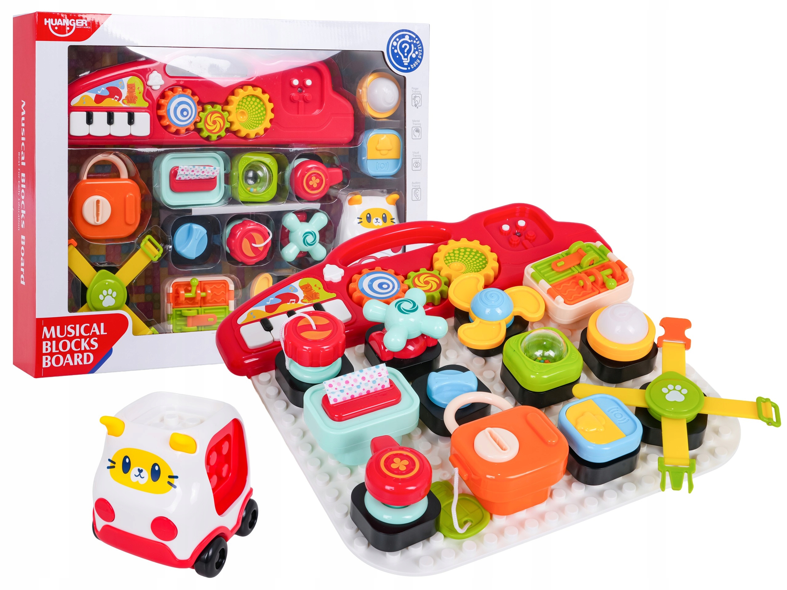 У набір також входить машинка, яка дозволяє кріпити блоки з боків і зверху. Іграшка має світлові та звукові ефекти, а піаніно запускає мелодії, звуки тварин або дозволяє грати по нотах. Блок живлення: 2 × AAA (не входить).