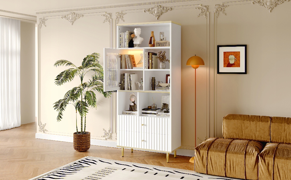 Багатофункціональна книжкова шафа 78 x 36 x 180 см, багатошаровий простір для зберігання, прозорі дверцята шафи, дві безшумні шухляди + дистанційне керування зі зміною кольору, металева основа, білий колір