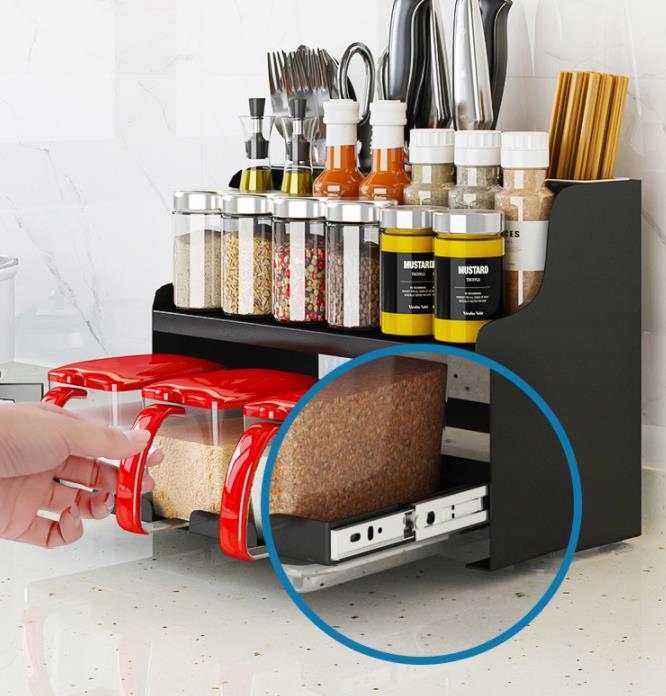 Багатофункціональна кухонна полиця для спецій (з контейнером для кухонних аксесуарів) - чорна, дворівнева