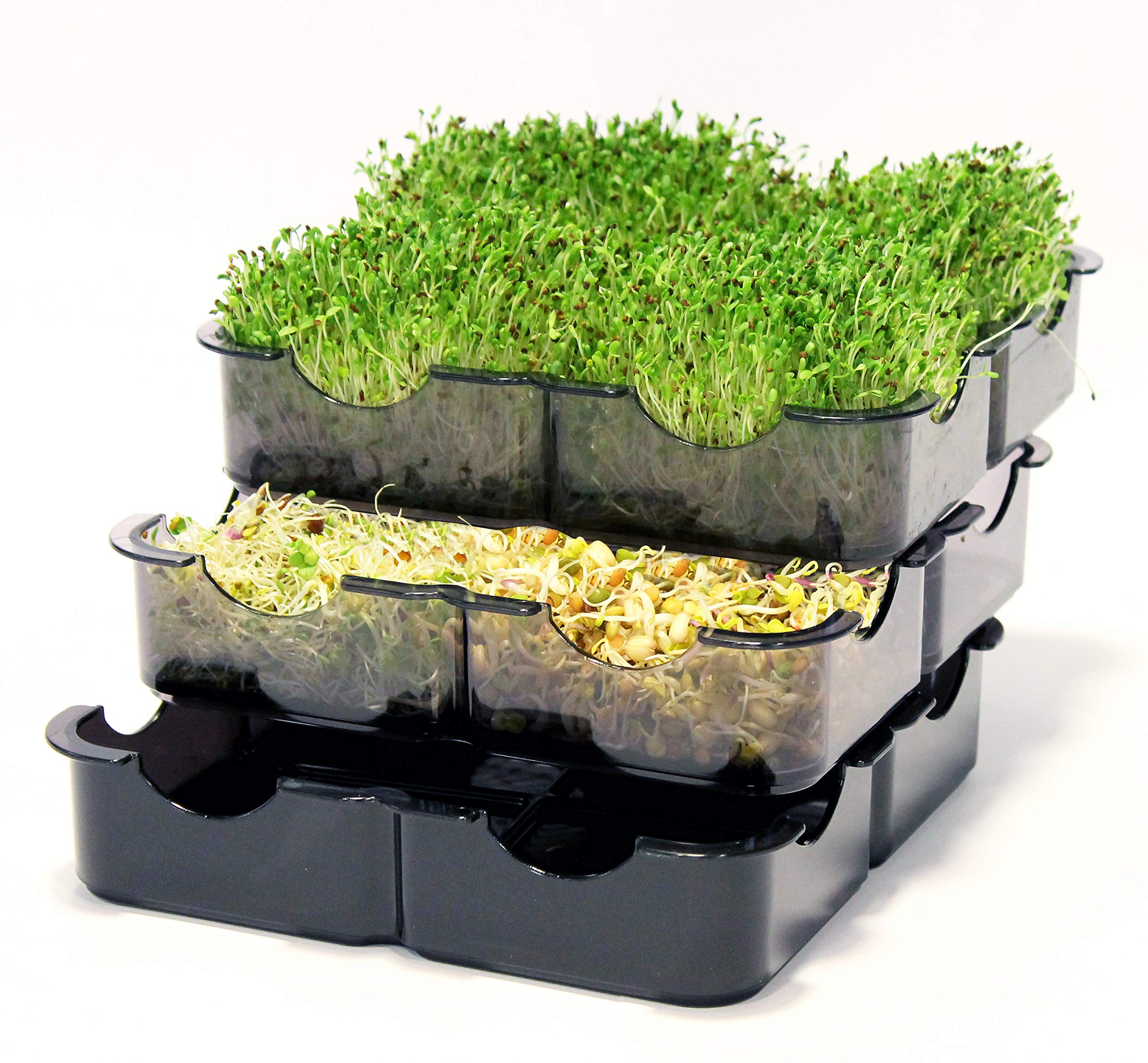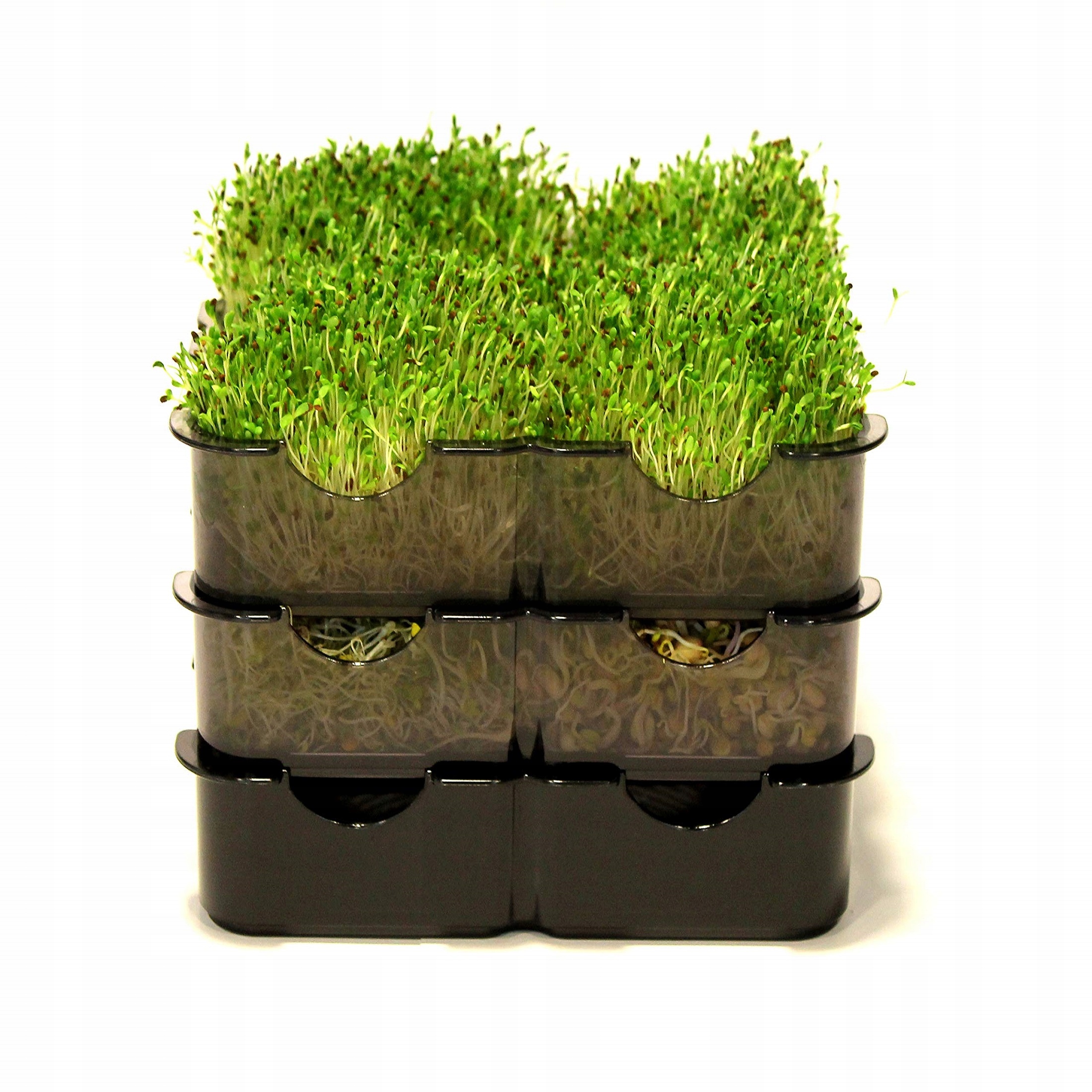 Складання між планшетами зручно та інтуїтивно зрозуміло. Верхня поверхня для проростання запатентованого багатофункціонального лотка має особливий V-профіль, який значно полегшує рівномірний розподіл насіння різного розміру по всій поверхні. Дуже вузькі дренажні отвори утримують набагато більше і більше води після кожного поливу, щоб насіння було краще зволожене, тому час замочування можна значно скоротити, а кількох щоденних поливів більш ніж достатньо.