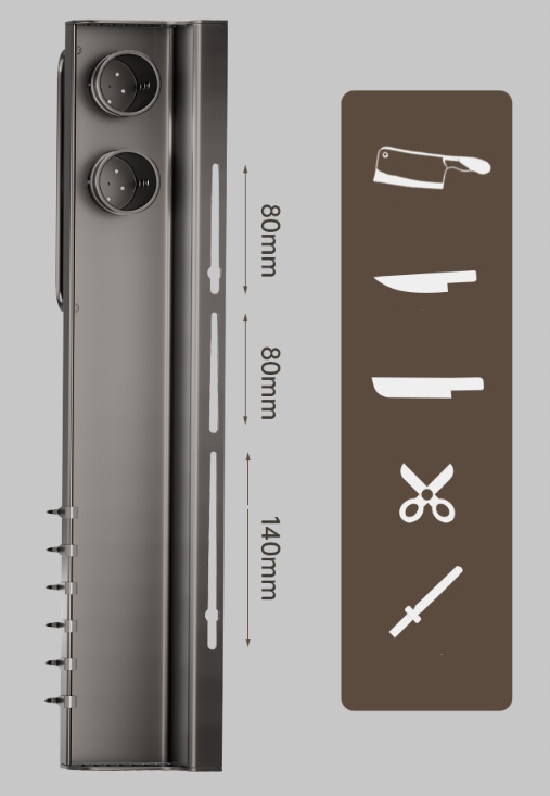 Простір для зберігання високої ємності не займає стільницю кухні і використовує простір на стіні, щоб заощадити простір. Кухонний посуд призупинений і зберігається для легкого використання.