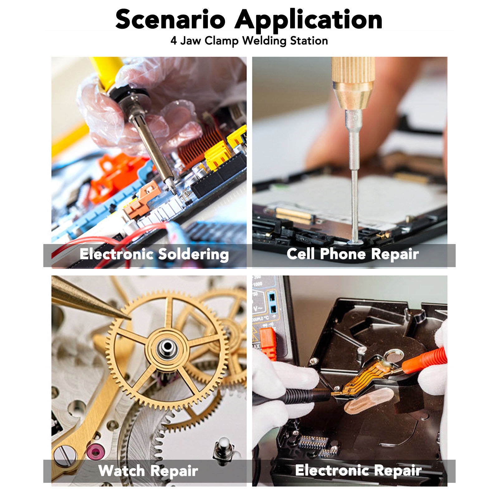 4. Ізольовані захисні затискачі: кожен з чотирьох затискачів може зберігати предмети з максимальною товщиною 18 мм і розроблені з ізоляцією для запобігання статичної електроенергії, забезпечуючи безпечну роботу. Гума -підкладка проти ковзання на хомутних щелепах забезпечує непохитну ручку ваших творів, що дозволяє зосередитись на точності, не боячись ковзати.