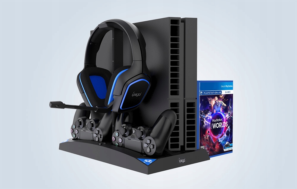 Завдяки підставці iPega ви можете зберігати як консоль, так і її аксесуари в одному місці. Продукт сумісний з PS4, PSR Slim і PS4 Pro. Він пропонує функцію зарядки, завдяки якій ви можете швидко поновити енергію своїх контролерів. Оснащений 2 вентиляторами, що забезпечить безпеку обладнання. Він також може вмістити навушники та 17 ігор.