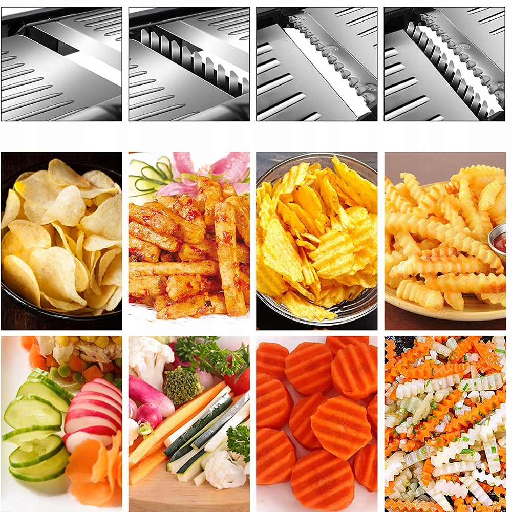 - 🏡 - 【Універсальне використання】: ця овочерізка може нарізати дуже тонко. товщиною до 9 мм. Дві настройки жульєну: 4,5 мм і 9 мм. Наш слайсер швидко і безпечно приготує корисні страви з овочів, картопляних чіпсів і картоплі фрі. Пристрій складається, тому його легко зберігати в шухляді.