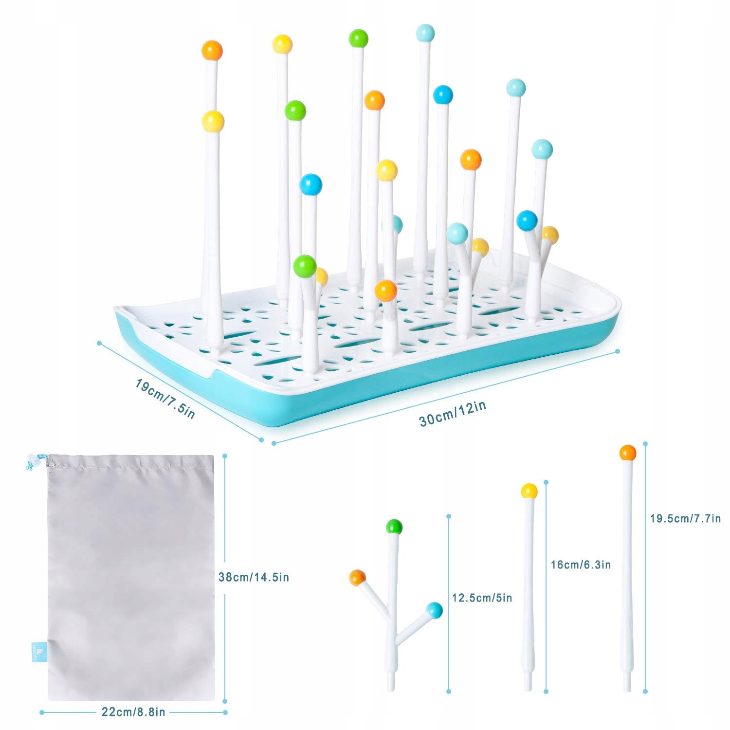 - Багатофункціональність: стовпи різного розміру виготовлені з товстого пластику та мають сферичну конструкцію, яка запобігає тертю пляшок одна про одну. Можна розмістити пляшечки будь-якого розміру, соски та інші аксесуари. Він також чудово підходить для скляних кухлів на кухні чи у ванній.
