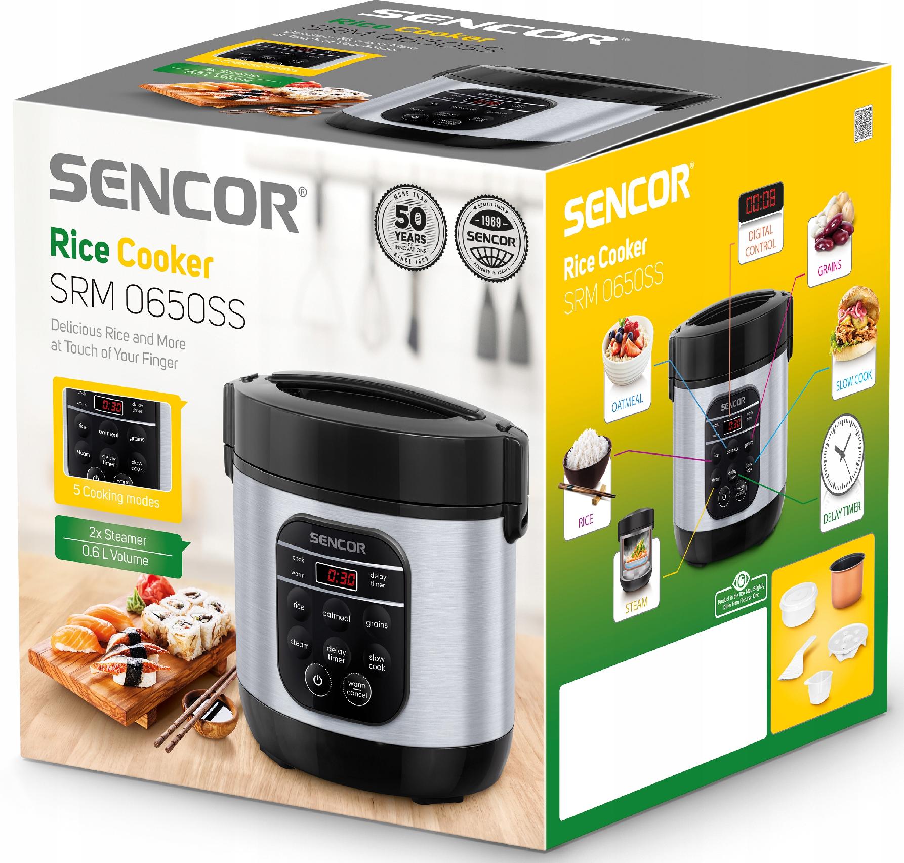 Sencor SRM 0650SS b> дозволяє зварити відразу 450 г рису, використовуючи 0,6 л води. Завдяки товщині стінок ємності 1,5 мм рис проварюється дуже рівномірно, не підгорає і не злипається. Посуд дуже легко миється. Готовий рис залишається теплим до 12 годин завдяки практичній функції Keep Warm.