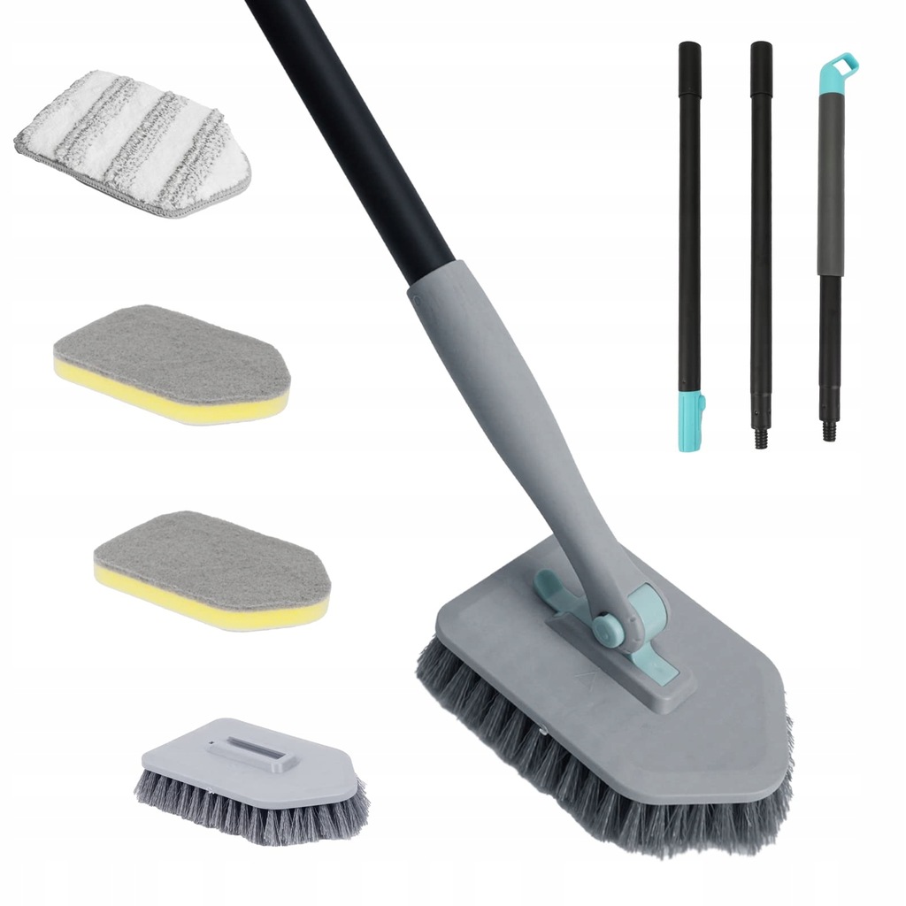 - Щітка Скруббер 3-в-1 із довгою ручкою оснащений трьома різними високоякісними очисними головками - щіткою з щетини, губкою та накладкою з мікрофібри. Щітки з жорсткою щетиною чудово очищають стійкий бруд з плитки для підлоги, наконечники губок чудово очищають плями на делікатних поверхнях, а подушечки з мікрофібри чудово очищають скло, стіни та інші поверхні.