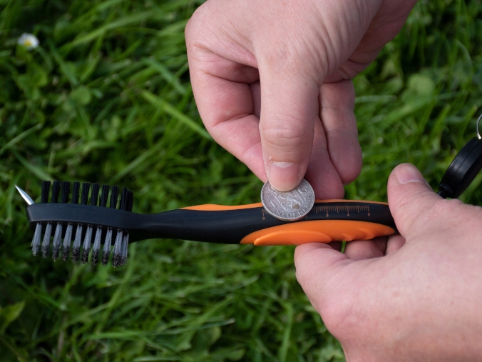 Після первинного очищення знахідки ми можемо ближче розглянути її за допомогою лупи та виміряти за допомогою мірної стрічки, прикріпленої до ручки. Щітка має ще одне практичне доповнення у вигляді ретрактора - автоматично розкладається шнурок (довжиною 55 см) з алюмінієвим карабіном на кінці.