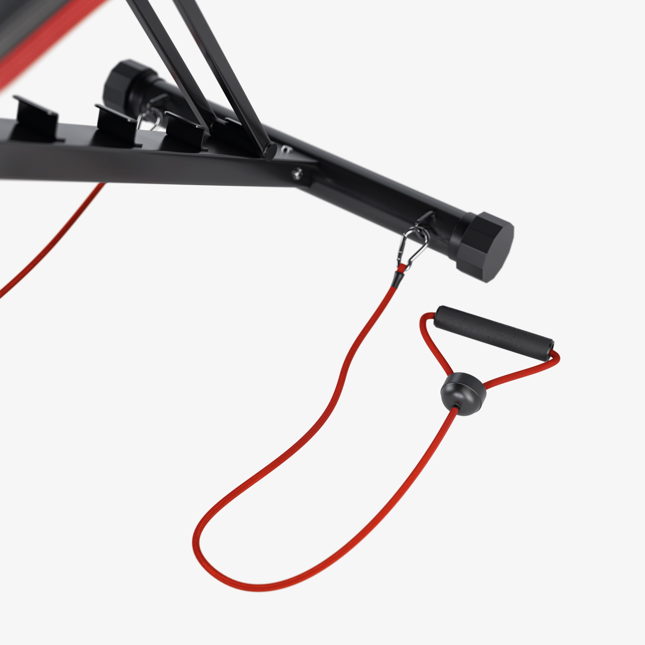 Гнучкі тренувальні каучуки прикріплені до лавки, що дозволяє отримати ще більшу різноманітність вправ. Завдяки їм ви можете активувати додаткові частини м’язів - особливо плечі та спину - без необхідності інвестувати в додаткове обладнання. Це прекрасний спосіб диверсифікувати навчання та підвищити його ефективність.