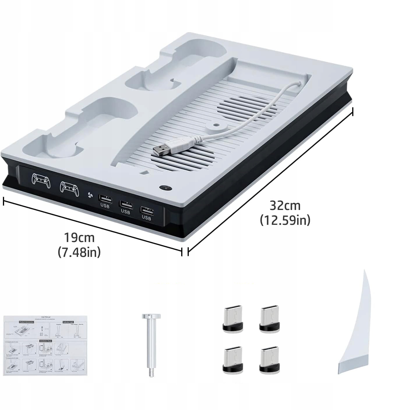 - Міцна база PS5 + потужний вентилятор PS5 + дві зарядні станції контролера PS5 зі світлодіодними індикаторами та 4 зарядними адаптерами Type-C + підставка для навушників + слот для дистанційного керування + додатковий концентратор USB із 3 портами + USB-кабель + кнопковий вентилятор.