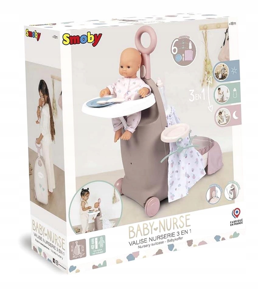 Там можна знайти: спальне місце для ляльки, стільчик для годування, полиці для зберігання. Включає 6 аксесуарів, включаючи: вішалки, миска, ложка, пляшка. Набір для ляльки до 42 см (лялька в комплект не входить). Валіза має висувну ручку.
