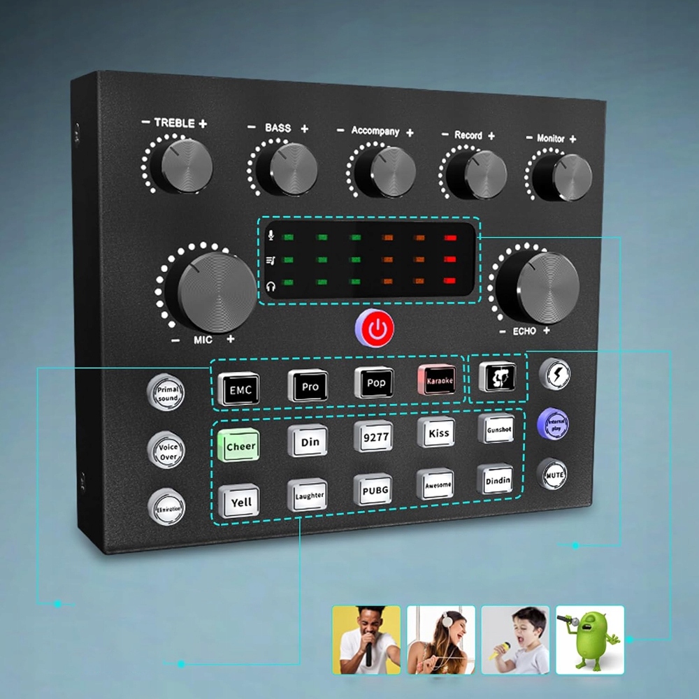 - Звук карта має різні режими, такі як професійний режим, популярний режим, одноклавішний крик, одна клавіша електронної музики тощо.