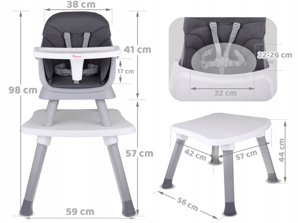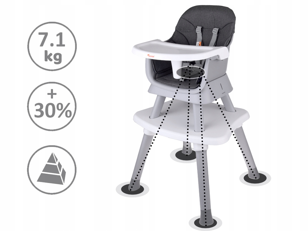 Це не просто стільчик для годування, це ще й шезлонг, крісло, дитячий стільчик, низький стільчик і табуретка. Конструкція дозволяє легко змінювати функції, адаптуючи меблі до рівня розвитку дитини та поточних потреб.