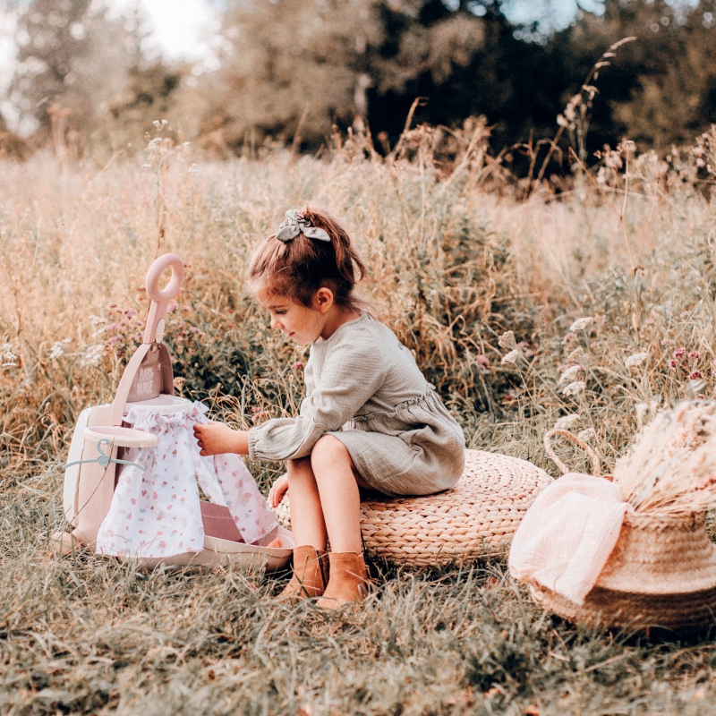 У розкладеному стані валіза станестільчиком для годування, вішалкою для одягу, а його нутро перетвориться на затишне ліжко для вашої улюбленої ляльки, яка має < b >максимум 42 см.