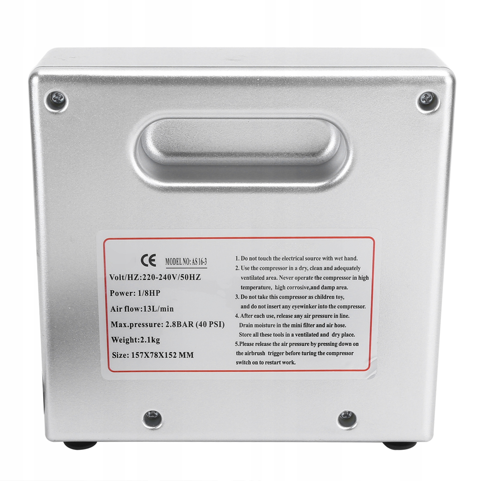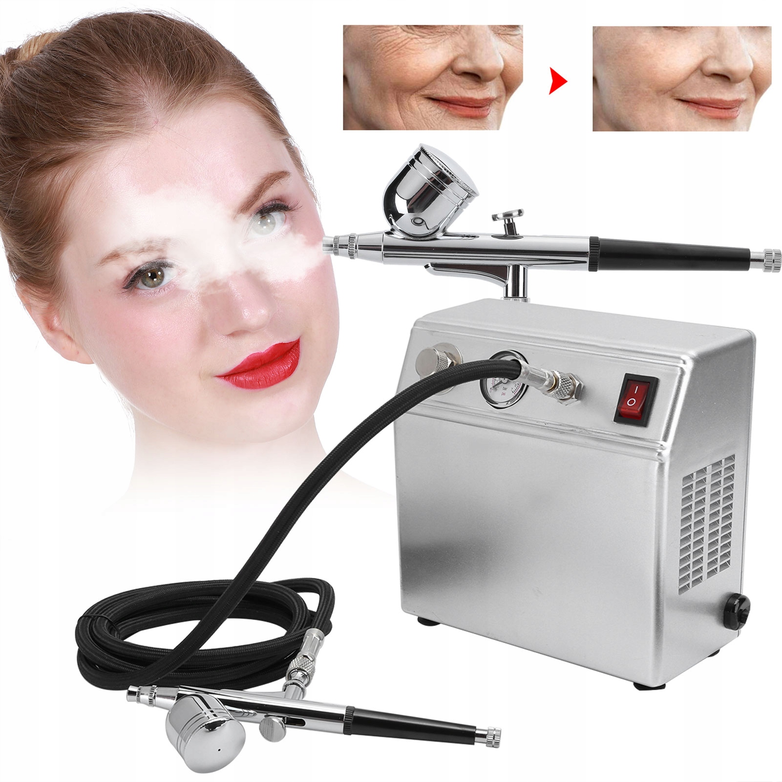 1. Тиск може бути відрегульований, вони можуть бути запущені під тиском і можуть працювати постійно, потужність висока, барометр безпосередньо відображає робочий тиск і найвищий тиск. Застосовується до догляду за шкірою голови, нанесення шкіри голови, догляду за шкірою, сонцезахисних ванн, татуювань, прикраси нігтів, обприскування тортів тощо.