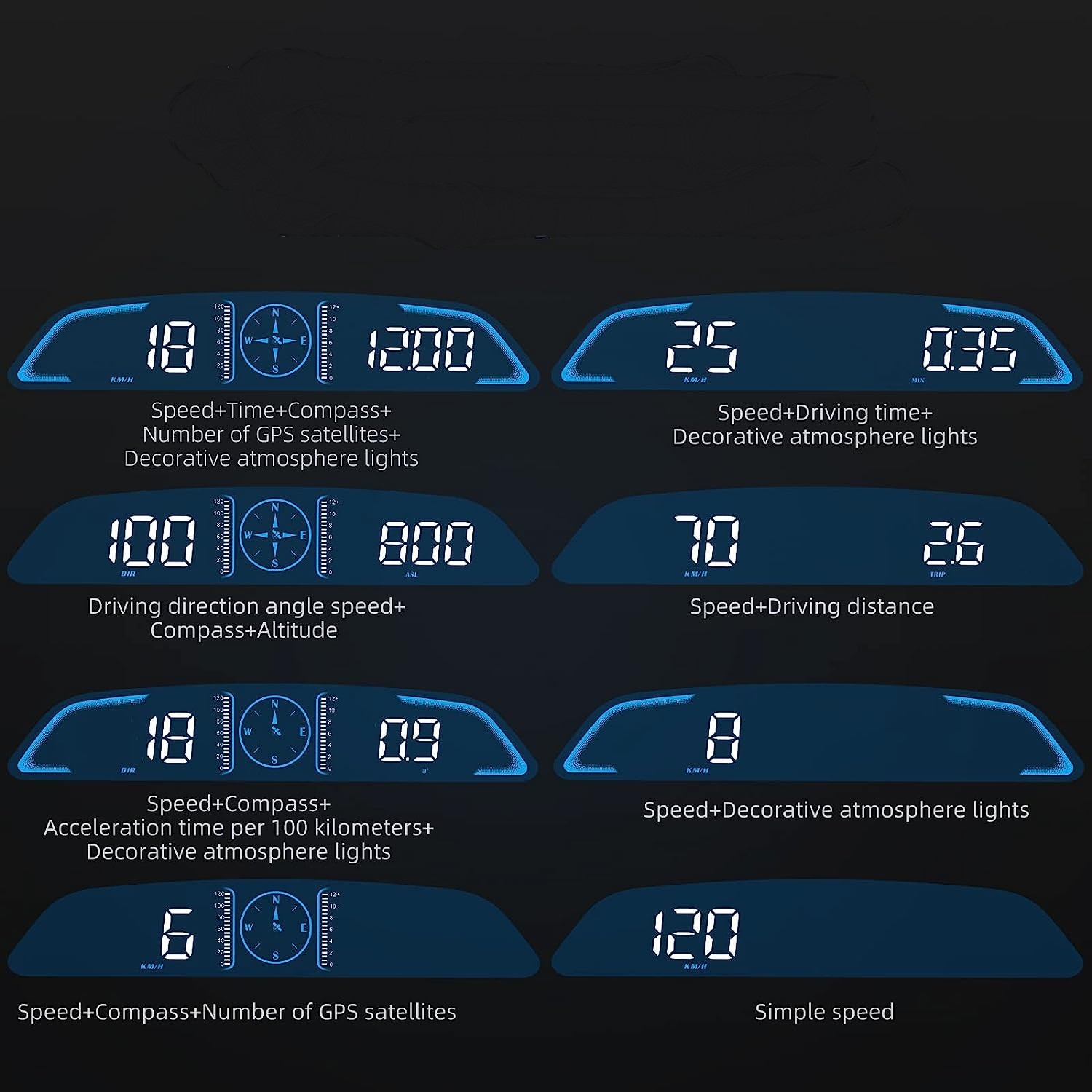 Що він може пропонуємо цей проекційний дисплей, його привабливі функції, такі як швидкість, годинник, напрямок руху, одна відстань, час однієї поїздки, кількість супутників, час прискорення на 100 км, кут руху, сигналізація швидкості, попередження про втому, перемикання кілометрів/миль, автоматичний регулювання яскравості
