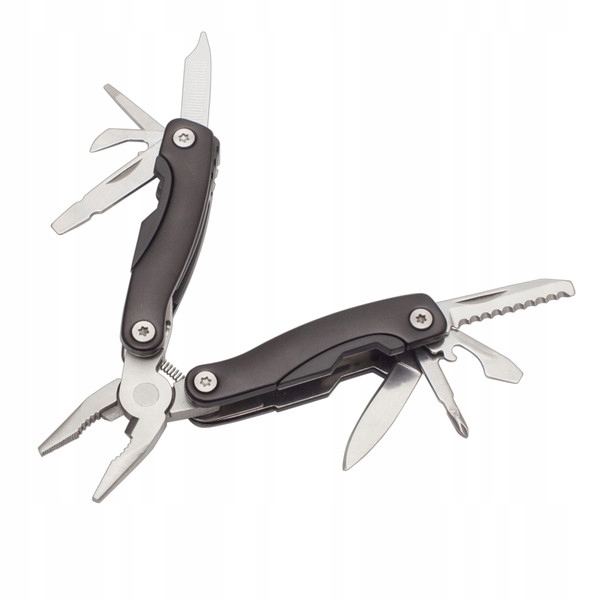 9-функціональний інструмент в алюмінієвому корпусі, кишенькова версія інструменту Feat.Леза виготовлені з нержавіючої сталі. Упакований в поліестеровий футляр. Інструмент включає: ніж, хрестоподібну викрутку PH, відкривачку для пляшок, плоску викрутку середнього розміру, зубчастий ніж, комбіновані плоскогубці з ножицями для різання дроту, маленьку плоску викрутку, консервний нож, однорядний файл і подвійний однорядний файл. файл рядків.