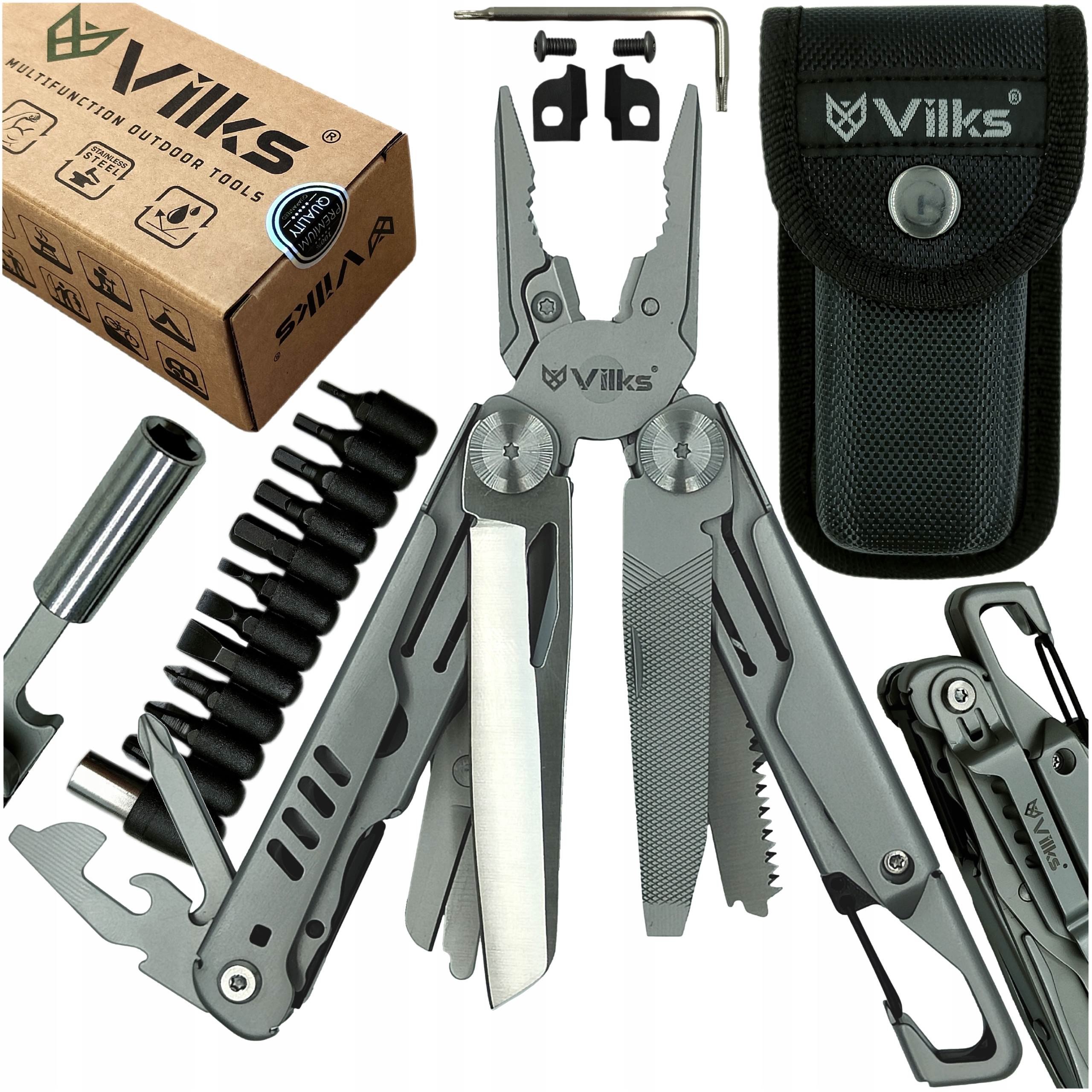 Multitool Vilks® це набір практичних інструментів і багатьох функцій в одному, виготовлених з високоякісних матеріалів b >. У ньому багато корисних інструментів: плоскогубці та кусачки, ніж, ножиці, хрестова викрутка та дві плоскі викрутки (мала та велика), консервний нож, консервний нож, шило, набір 11 біт з магнітним тримачем, змінний запасний комплект. різці ріжучі ножі та багато іншого.