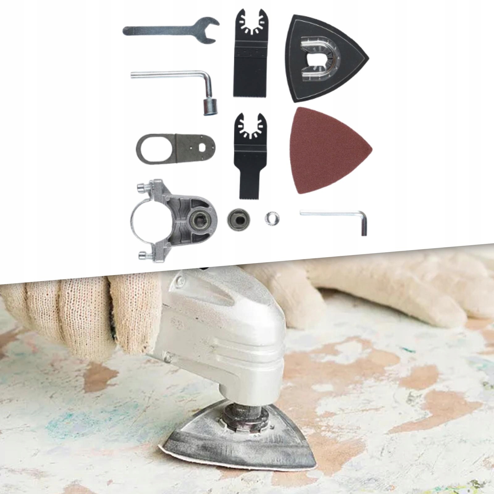 [Матеріал]: Набір коливальних пристосувань інструментів перетворювача виготовлений з металевого матеріалу з високою твердістю, твердим та. Застосування]: Коливальний інструмент можна використовувати для різання, шліфування та інших матеріалів, підходящих для деревини, гіпсокартону або металу, шліфування, видалення іржі та саморобки.