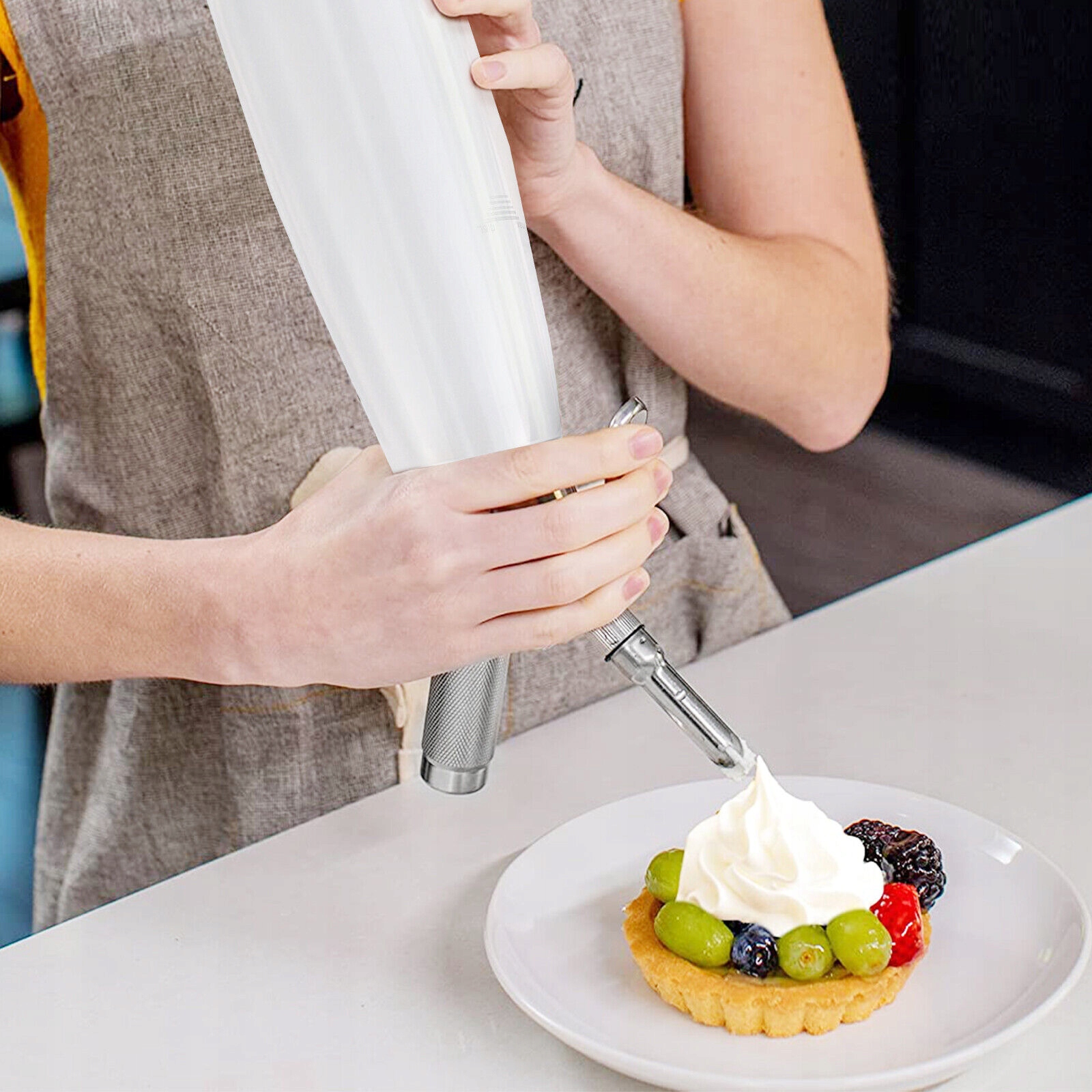 За допомогою цього продукту ви можете створювати красиві кремові візерунки зі збитими вершками, прикрашати торти, бамбо, муси , кава, супи, соуси, божевільні десерти та інше (як гарячі, так і холодні), смачно та красиво.