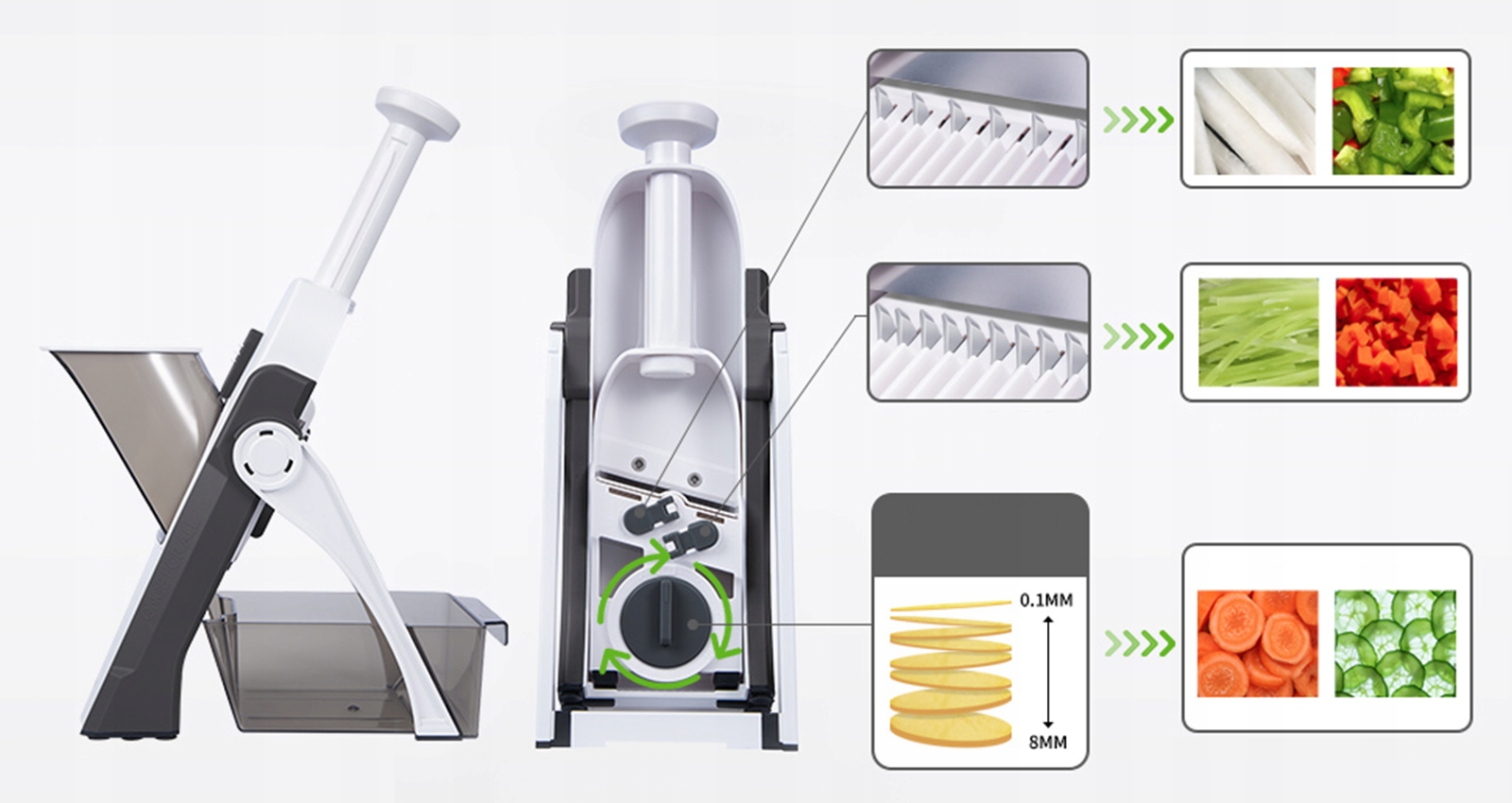 - 🥕 На відміну від старих овочерізок, ця овочерізка позбавить вас від клопоту та небезпеки заміни лез.