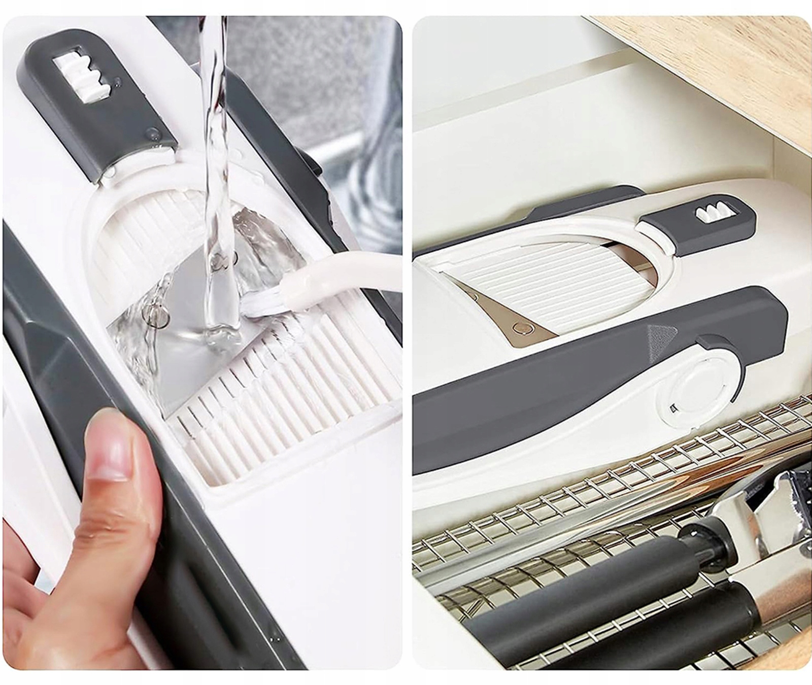- 🥒 Овочерізка складна і має компактну конструкцію, її невеликий розмір займає мало місця в шафі, щітка в комплекті легко видаляє відкладення на лезі, ідеальний подарунок на весілля чи новосілля.