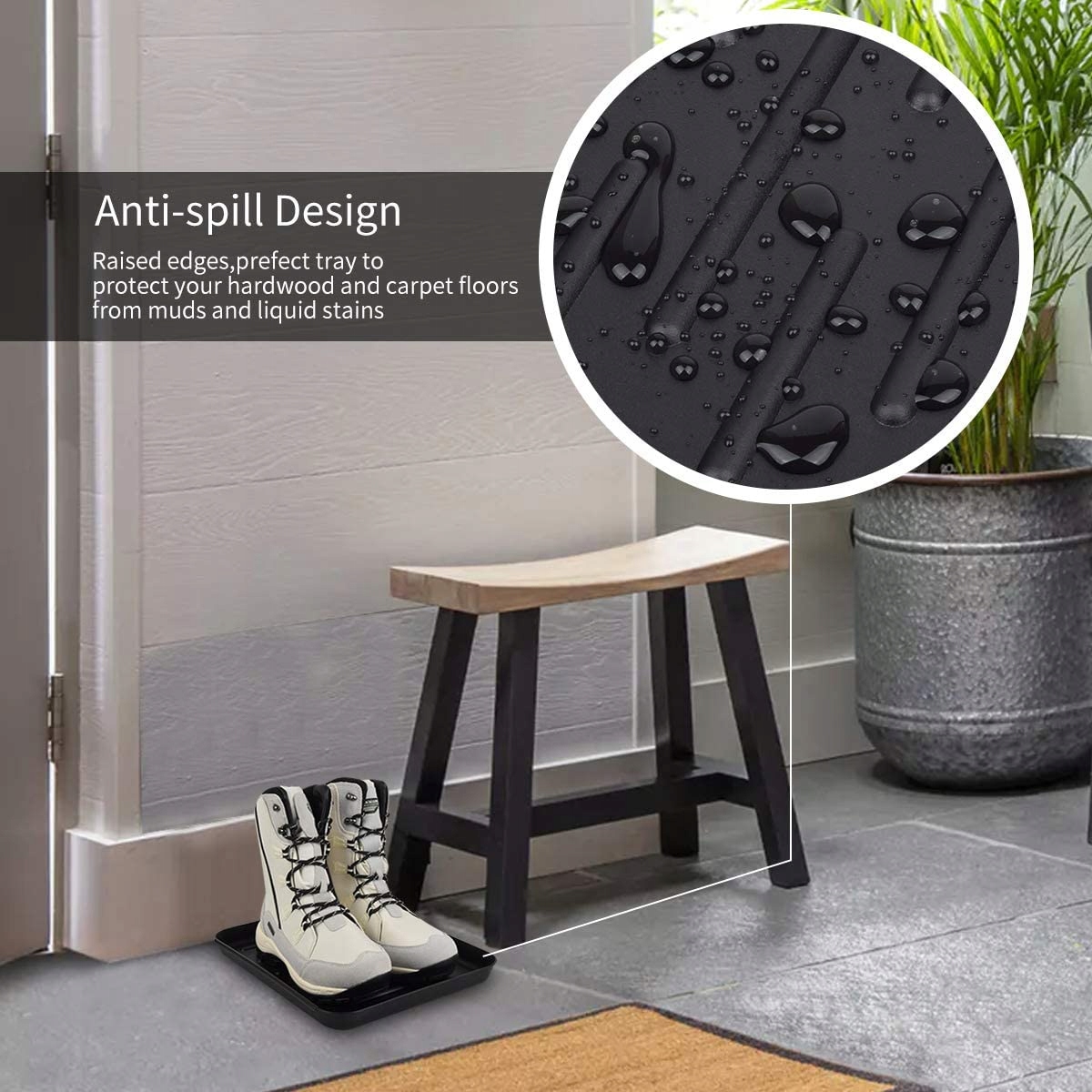 Кожний лоток має піднятий край, щоб допомогти зменшити безлад від щоденного бруду, крапель дощу, котячого туалету, рослин у горщиках тощо. Поверхня килимка дозволяє підошві взуття швидше висихати.