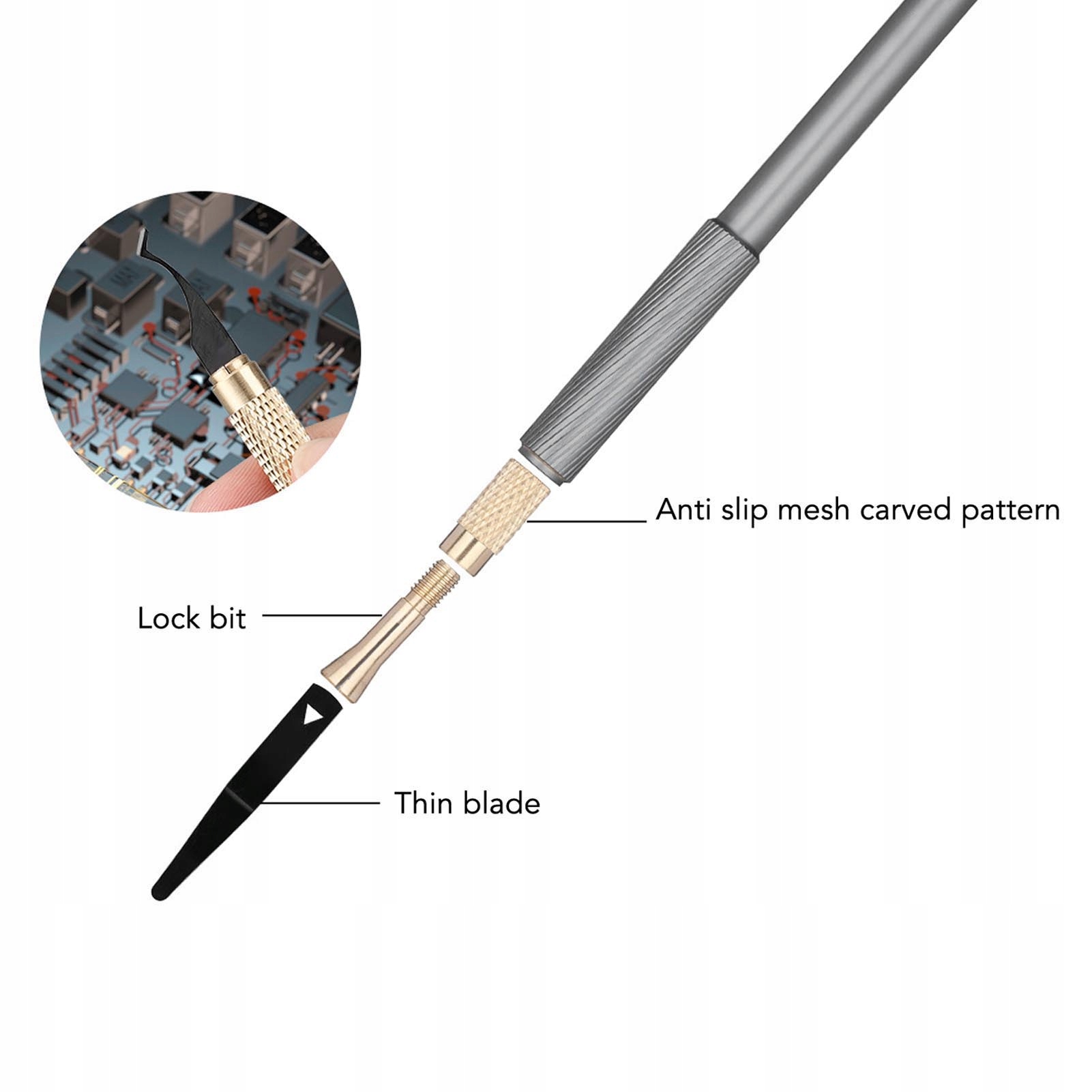 1, універсальне видалення клею: багатофункціональний набір ножів спеціально розроблено для ремонту материнських плат iPhone. Ефективно видаляє клей і тверду гуму, полегшуючи ремонт. 2、Комплексний набір для ремонту: набір включає 4 різні ножі для різних потреб у ремонті, усі зручно зберігаються в твердому пластиковому футлярі для зручності перенесення. 3、Безпека та точність: завдяки унікальному нековзкому візерунку та механізму фіксації ножа ножі гарантують безпечну та точну роботу під час ремонту. 4、Підходить для професіоналів і DIY: незалежно від того, чи ви професійний технік, чи ентузіаст DIY, набір ножів є важливим інструментом для ремонту iPhone. 5、Матеріали з алюмінієвого сплаву: виготовлений із алюмінієвого сплаву та мідної голівки зі стійким до окислення покриттям, набір ножів для хобі міцний і забезпечує тривале використання.