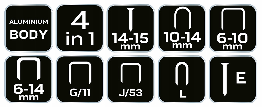 Багатофункціональний оббивний степлер NEO 4-в-1 (арт. № 16-030) для скоб J, G, L, E, розміри від 6 до 14 мм. Ідеально підходить для оббивних і декоративних робіт, для кріплення фольги, шкіри та інших матеріалів. Завдяки регулюванню рушійної сили скоби його можна використовувати як для твердих, так і для м’яких матеріалів. Забиває скоби точно, не здавлюючи їх, навіть у твердих матеріалах. Корпус степлера виготовлено з алюмінію.