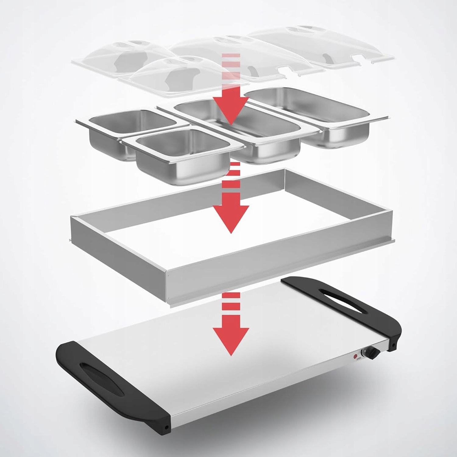 - 1 нагрівальний столик (2 x 2,5 л + 2 x 1 л), основа з ніжками, кришками та контейнерами в комплекті