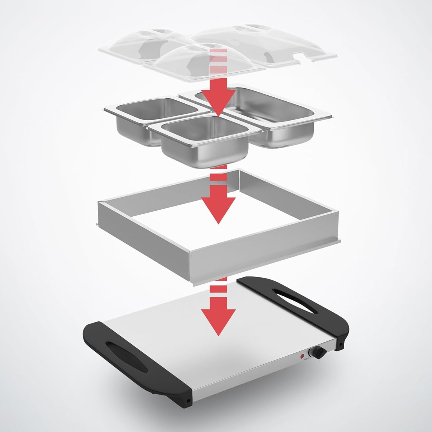- 1 x буфетний підігрівач (1 x 2,5 л + 2 x 1 л), основа з ніжками, кришками та контейнерами в комплекті