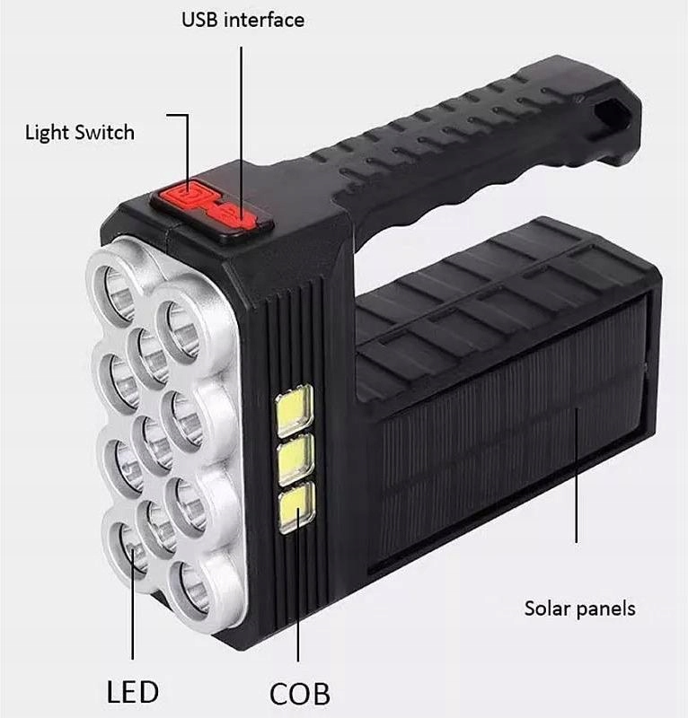 Багатофункціональний портативний ST11 ліхтарик ST11 - це незамінний інструмент при кемпінгу, риболовлі або мандрівці. Оснащений 11 світлодіодами (1 Вт) та трьома модулями COB, забезпечує виняткову універсальність. Ліхтарик пропонує як цілеспрямований світловий пакет (ідеально підходить для художника), і сильне, розсіяне світло (чудово підходить для освітлення намету або широких пробілів). Завдяки побудованій сонячній панелі ви можете поповнити її протягом дня, і якщо у вас є доступ до зарядного пристрою, ви можете легко зарядити його за допомогою USB -порту. /b>: