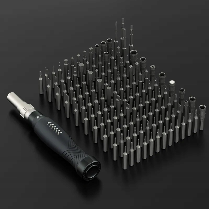 - Набір інструментів містить 145 елементів для ремонту електроніки