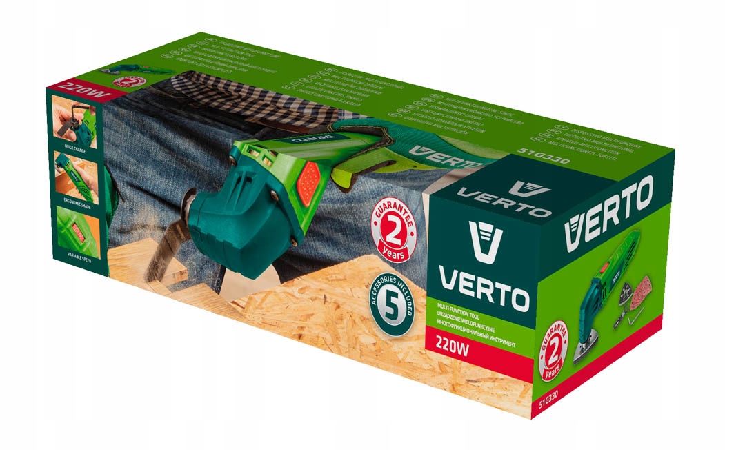 Прилад потужністю 220 Вт має величезну кількість застосувань, єдине обмеження - фантазія користувача. Головка приладу здійснює від 15 000 до 20 000 коливань за хвилину, кут коливань 2,8°. Маленький і зручний інструмент оснащений можливістю регулювання швидкості. Корпус редуктора виготовлений з міцного матеріалу, його зручна форма і невелика вага дозволяють працювати однією рукою. Довгий шнур живлення також полегшить роботу. У набір також входять: робочі наконечники та наждачний папір. Відповідність європейським стандартам безпеки забезпечується сертифікатом CE.