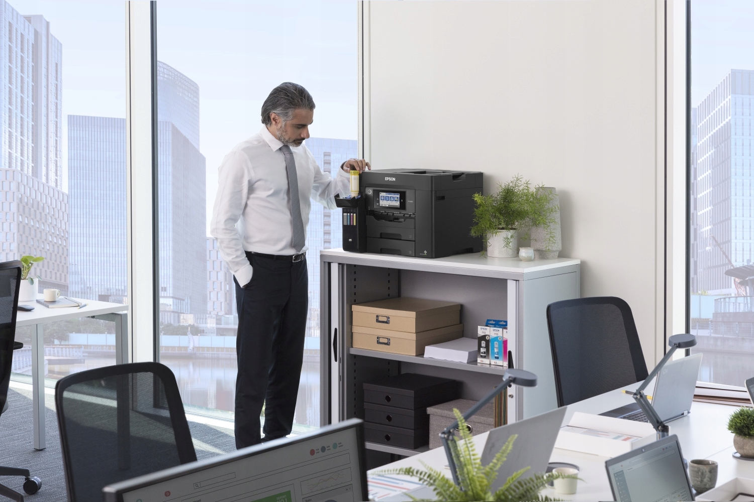 Друкуйте, скануйте, копіюйте та відправляйте факс за допомогою цього простого у використанні EcoTank, який забезпечує надзвичайно низьку вартість сторінки. Виконуйте завдання швидко завдяки високій швидкості друку та сканування, двом переднім лоткам на 250 аркушів, задньому лотку на 50 аркушів і автоматичному пристрою подачі документів на 50 аркушів. Друкуйте так, як вам подобається, завдяки мобільному друку, підключенню до Ethernet і сенсорному РК-екрану 10,9 см.