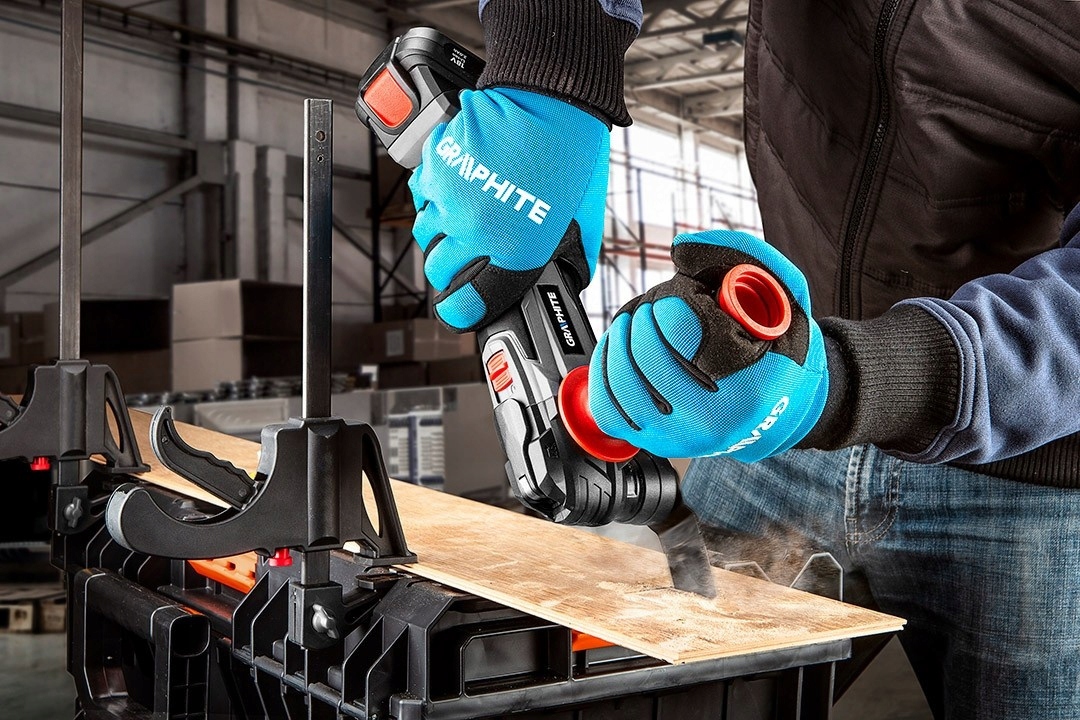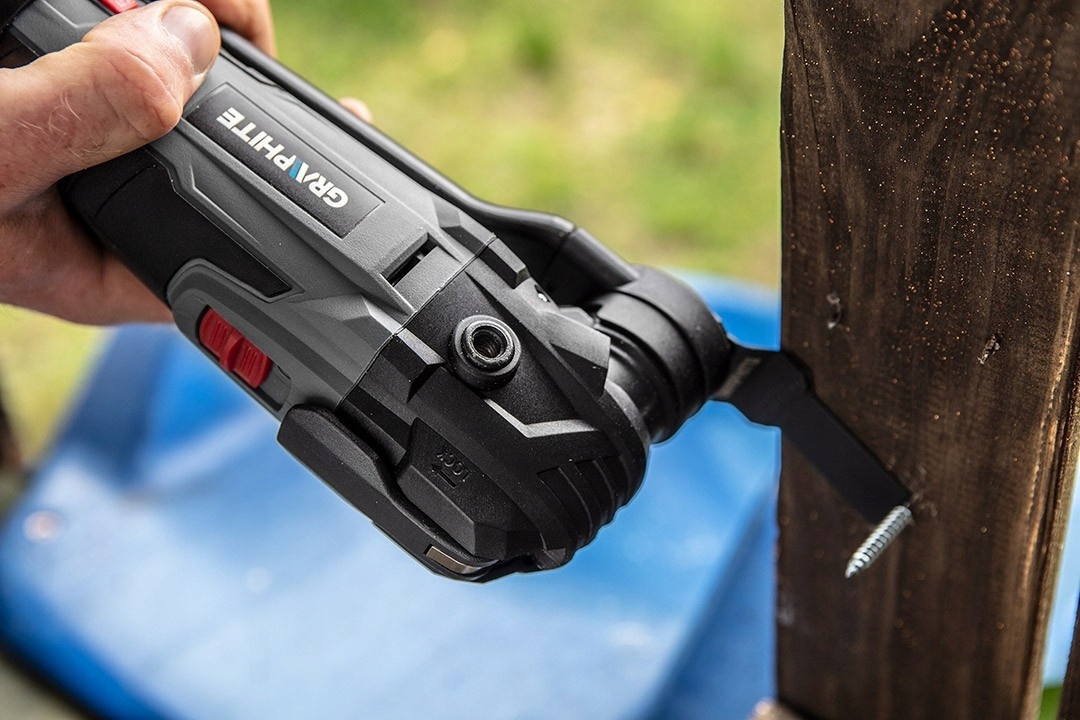 Багатофункціональний пристрій GRAPHITE, сумісний з Li-Ion акумуляторами 18V GRAPHITE Energy+. Це універсальний електроінструмент, призначений для різання, шліфування або скребка таких матеріалів, як метал, дерево або кераміка. Головка приладу здійснює від 5000 до 20 000 коливань за хвилину, кут коливань 3°. Пристрій оснащений системою швидкої та безінструментальної заміни аксесуарів. Завдяки універсальному тримачу інструменту користувач може використовувати різні робочі наконечники GRAPHITE, а також багато аксесуарів інших брендів. Корпус редуктора пристрою виготовлений з міцного алюмінієвого сплаву. У комплекті з електроінструментом є адаптер для відсмоктування пилу, який дозволяє підключати пилосос під час шліфувальних робіт. Спеціально профільована прогумована рукоятка забезпечує міцний хват і комфорт використання. Для більш надійного наведення електроінструменту можлива установка додаткової ручки в двох положеннях. Робоча зона підсвічується двома яскравими світлодіодами.