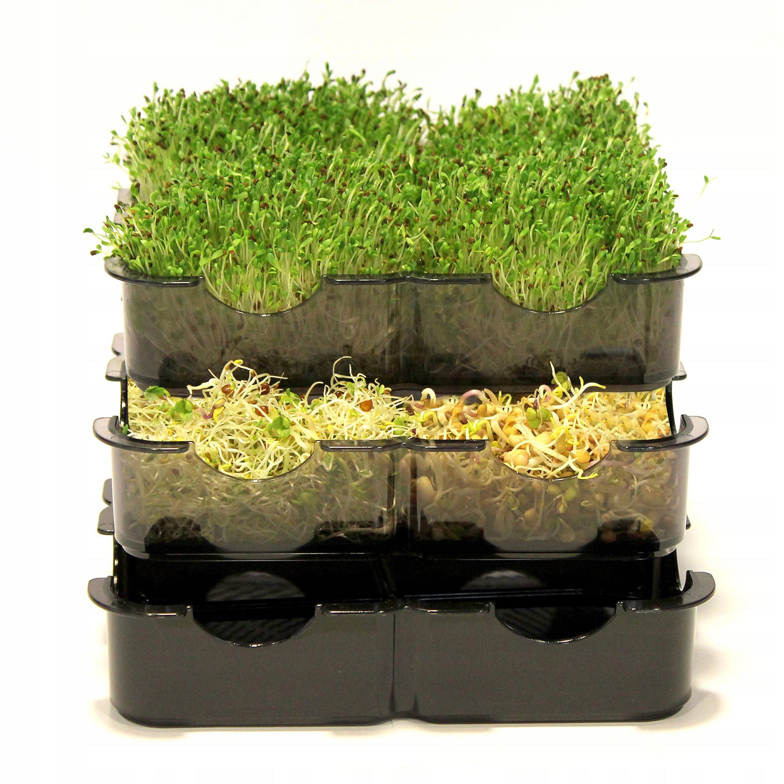Складання між планшетами зручно та інтуїтивно зрозуміло. Верхня поверхня для проростання запатентованого багатофункціонального лотка має особливий V-профіль, який значно полегшує рівномірний розподіл насіння різного розміру по всій поверхні. Дуже вузькі дренажні отвори утримують набагато більше і більше води після кожного поливу, щоб насіння було краще зволожене, тому час замочування можна значно скоротити, а кількох щоденних поливів більш ніж достатньо.